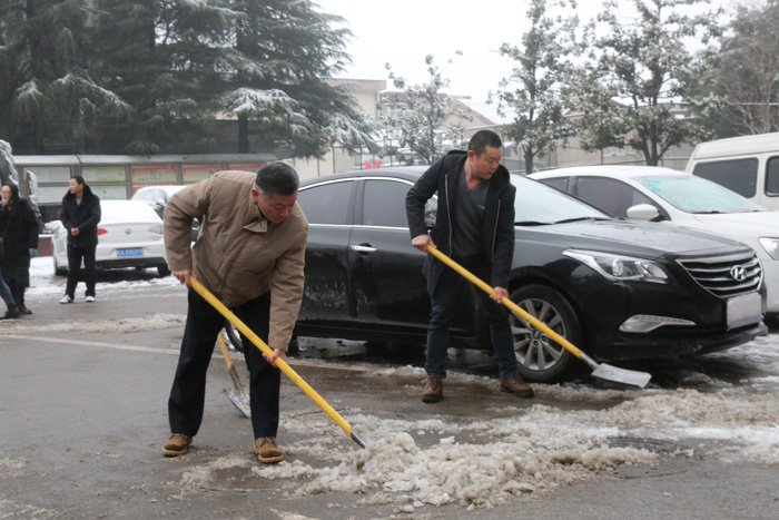 早晨7点30分,雪花仍在飞舞,寒风嘶吼,远处却见群人前行的背影——扫雪已经早早开始了。大家不畏严寒,顶着风雪,挥舞着铁锹、扫帚开始对院区的积雪和结冰进行清扫。彼此齐心协力,配合默契,铲的铲、推的推、扫的扫,干的热火朝天,忙碌的身影构成了道冬日里的风景线。