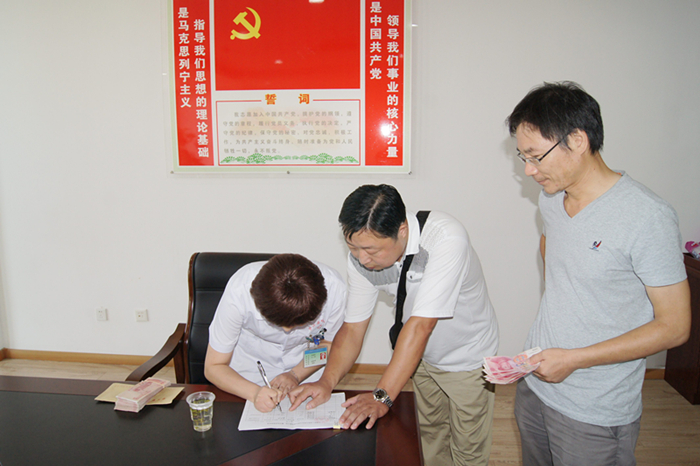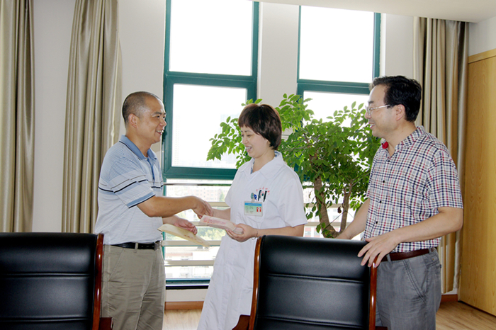 8月4日下午,市总工会申部长、江会计以及县总工会柏主席、朱股长等行六人来我院给两名职工送来了两万余元的互助金。