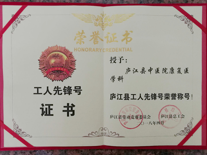 庐江县庆祝“五”国际劳动节暨表彰大会于4月28日下午隆重举行。我院康复医学科获得庐江县“工人先锋号”荣誉称号。