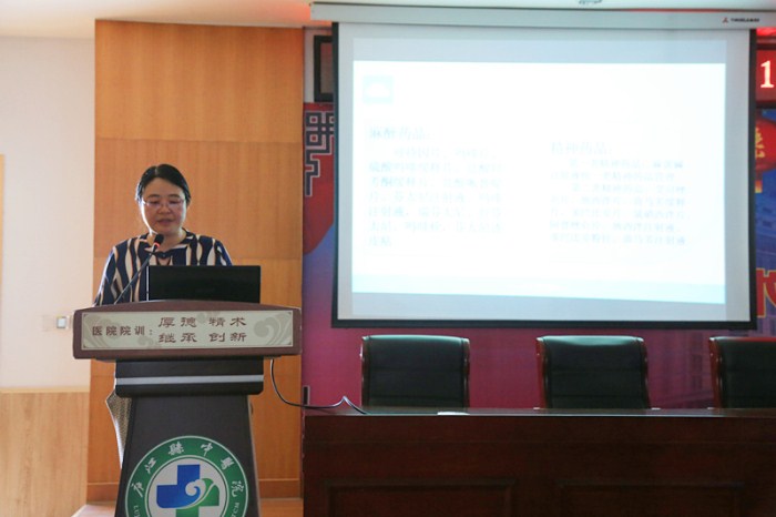 药学部徐玉萍主任主讲针对麻醉药品和精神药品使用知识对大家进行授课,生动形象的向大家介绍了选用原则,对麻醉药品与精神药品的处方开具注意事项进行了详细讲解。