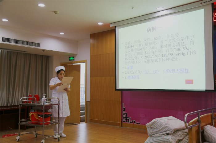 比赛由选手在题库中随机抽取病例,根据病例选手以责任护士的角色,运用望闻问切为患者做全面的评估、分析、辩证分型,进而针对存在的症候辩证施护,并采取特的中医护理操作技术缓解症状,同时从康复、起居、饮食、情志等方面进行中医健康教育。