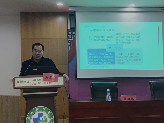 本次培训邀请到合肥市第二人民医院神经内科主任医师吴君仓授课,他从卒中中心的基本概念出发,具体阐述了脑卒中基础知识、卒中紧急呼救和卒中中心建设中需解决的问题等。参培人员认真聆听、记录,纷纷表示受益匪浅。