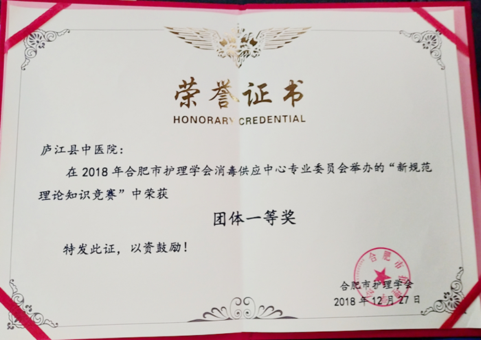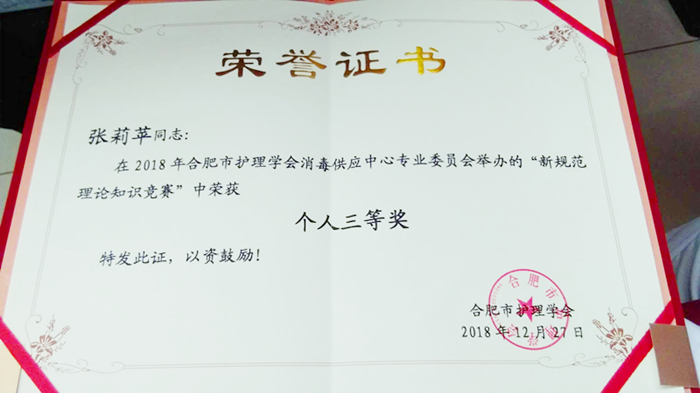 近日,在合肥市护理学会消毒供应中心专业委员会举办的“新规范理论知识竞赛”中,县中医院参赛团队斩获团体等奖。在个人项目中,张莉苹荣获个人三等奖。